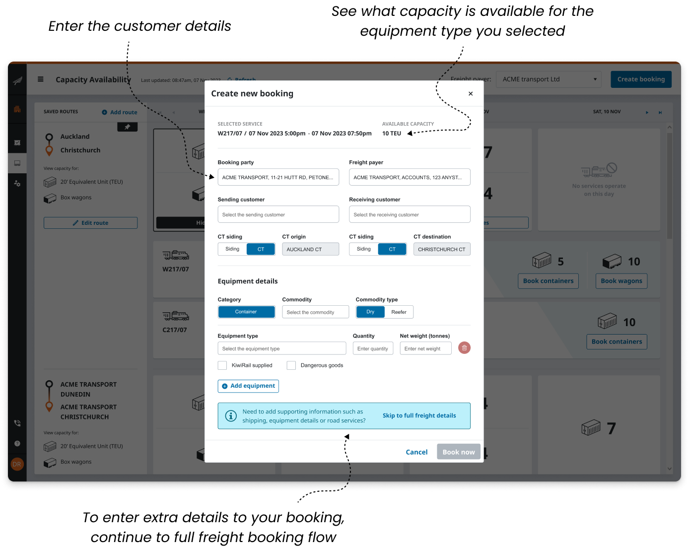 At the top of the quick book screen, the selected service details will be displayed as well as the available capacity for the chosen equipment type.