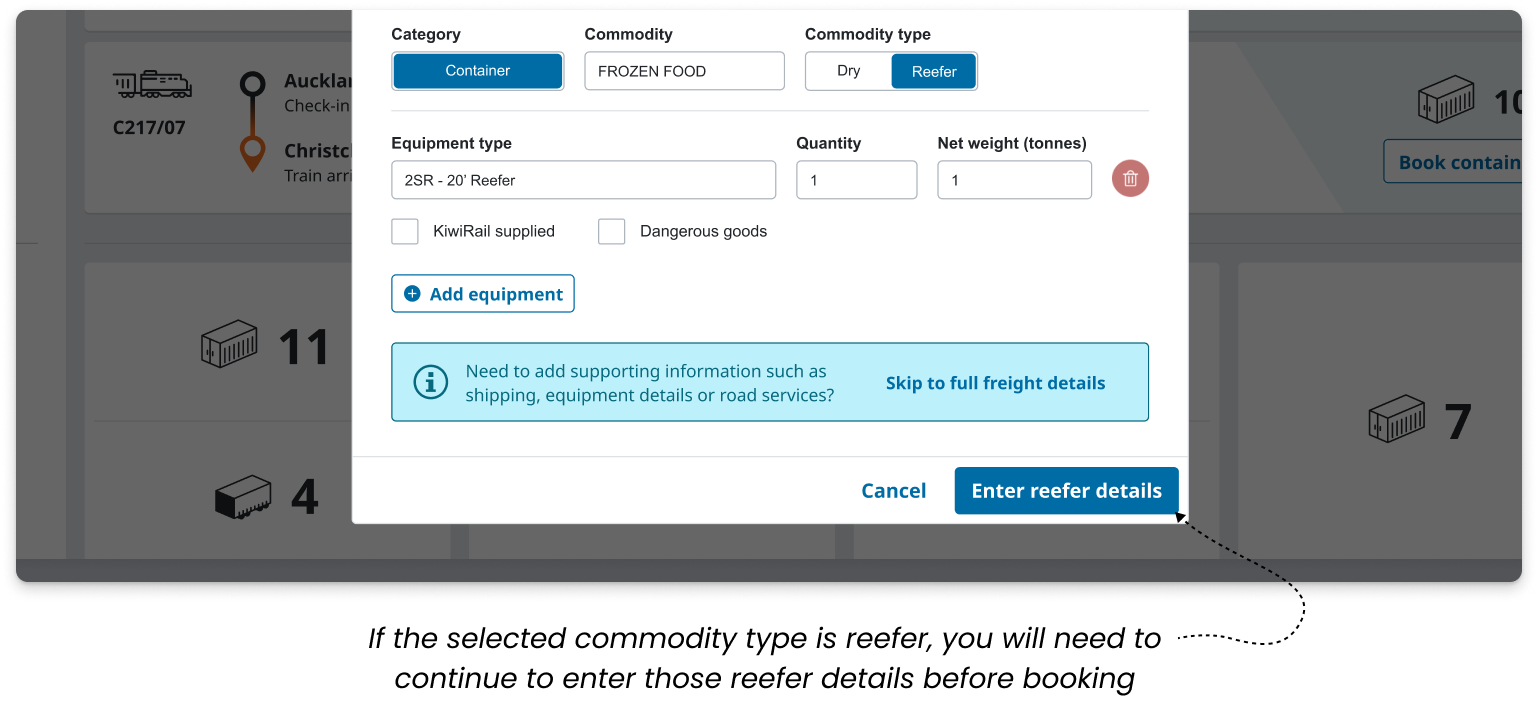 If you are booking temperature controlled (reefer) freight , you will be required to continue through to the full booking section of the portal. All pre-entered details will be retained to continue your booking experience. View How to book refrigerated freight for more instructions.