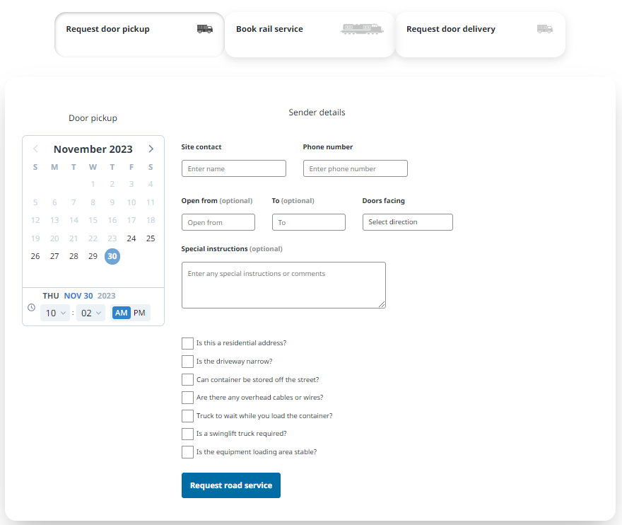 If you want us to arrange picking up a container from your Sending Customer, or drop it off to your Receiving Customer, click Request Door Pickup or Request Door Delivery to open the road service options: