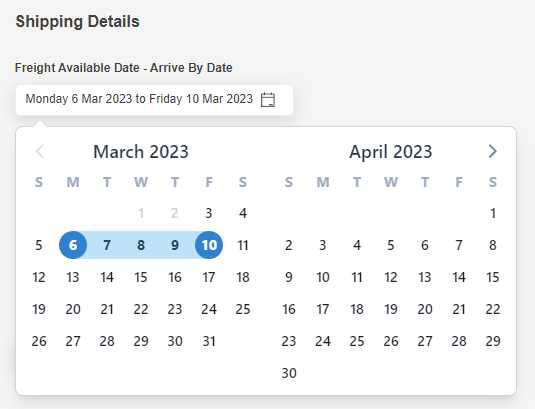 Freight Available Date - Arrive By Date: Let us know when your freight will be available at the origin, and when you need it at the destination. We’ll only show you services that meet these dates.