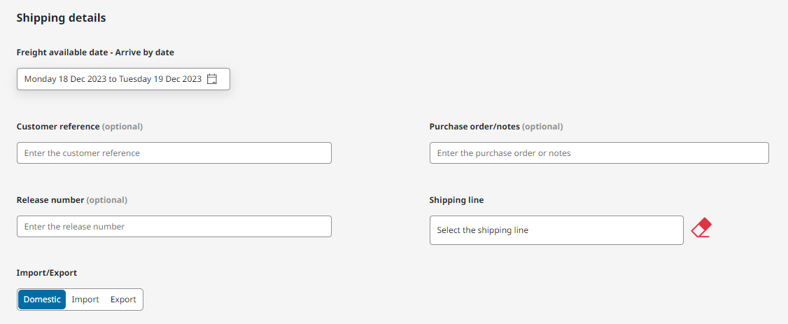 Import/Export: Select if the booking is for an import container or an export container. More information is required for these bookings, read the linked guides to learn more.