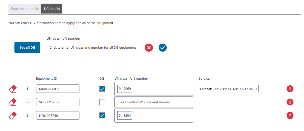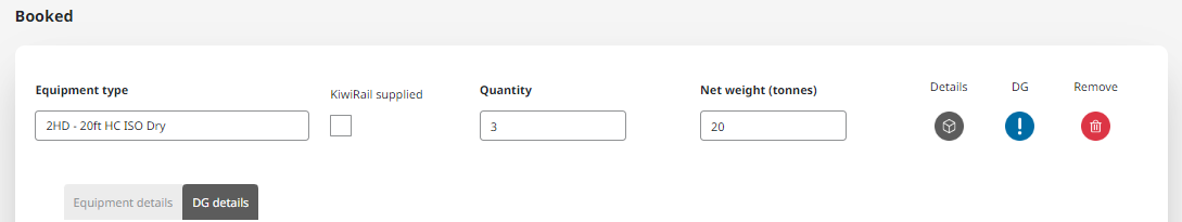 To book dangerous goods freight on the portal, you need to enter in the dangerous goods details. Click on the DG icon beside the equipment type:
